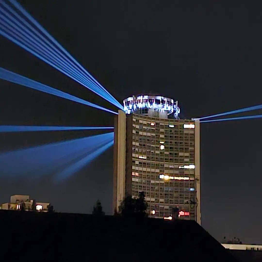 Images : 18 faisceaux lumineux dans le ciel de Mulhouse, sur le toit de la Tour de l'Europe.