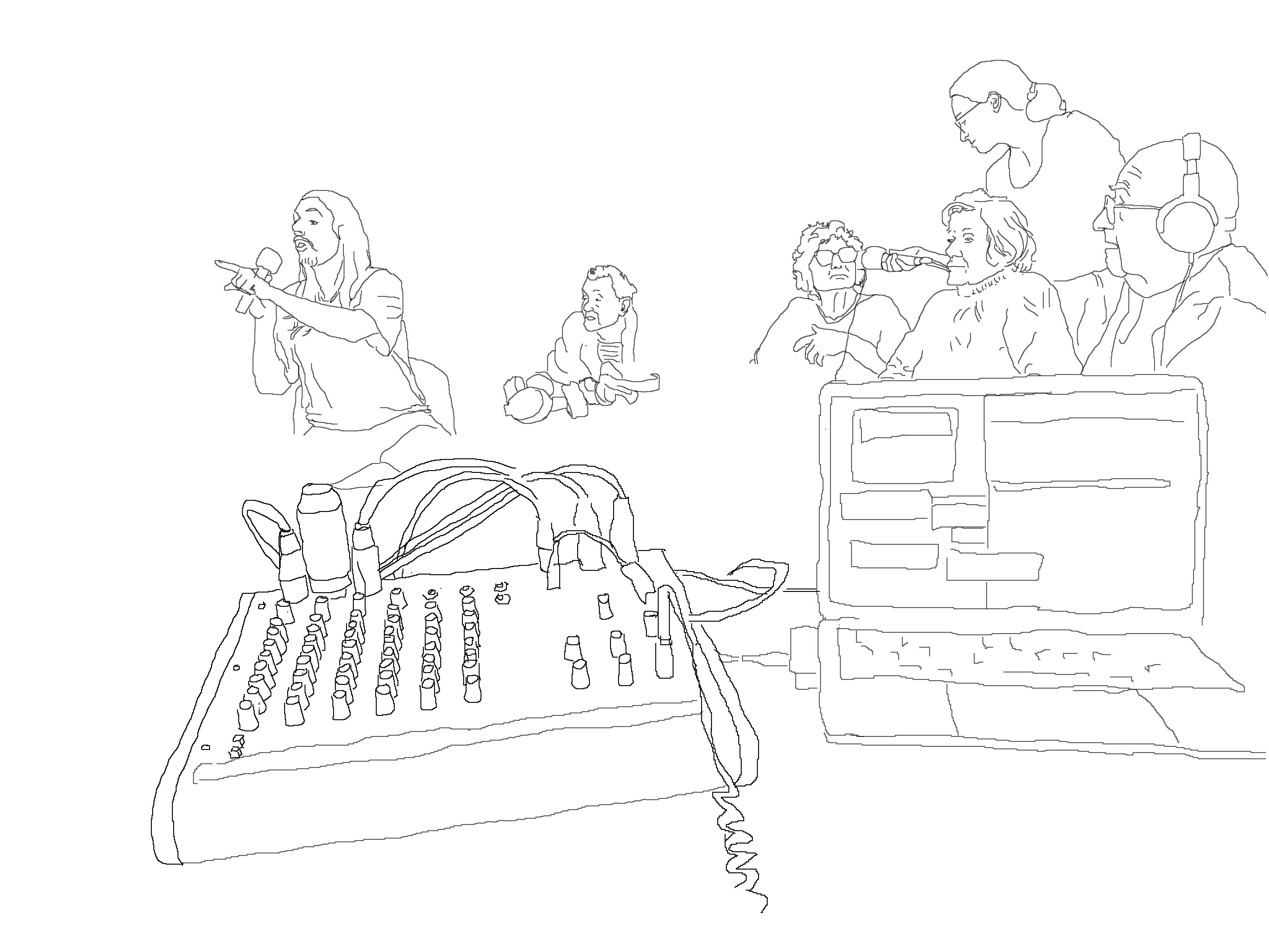 On s’installe sur trois tables rassemblées en une. Y prennent place, Claire, Michel, Nelly, Suzanne, Jeanne-Marie. Julie réalise, Anna et Frédéric passent les SM58 autour de la table, Antoine passe le Lem parmi l’auditoire composé de Marie-Claude, Jackie, Stéphane, Irène, Huguette, Clotilde, Paulette, Maurice et Colette. La conduite prévoit d’évoquer les ateliers des jours précédents, l’écoute du medley de chansons et un rendez-vous radiophonique avec la classe de l’école Saint-Joseph, à 15h. Iels nous entendront sur le DAB+ et communiqueront avec nous par sms. Tout se passe à peu près comme prévu sinon les aléas du direct et du réel. Les chansons nous chamboulent et nous brassent. Perrine (cadre de santé de La Chanterelle ?) passe par là et nous dit quelques mots sur cette série d’ateliers radio qui s’achève avec ce direct. On se dit « À bientôt. »