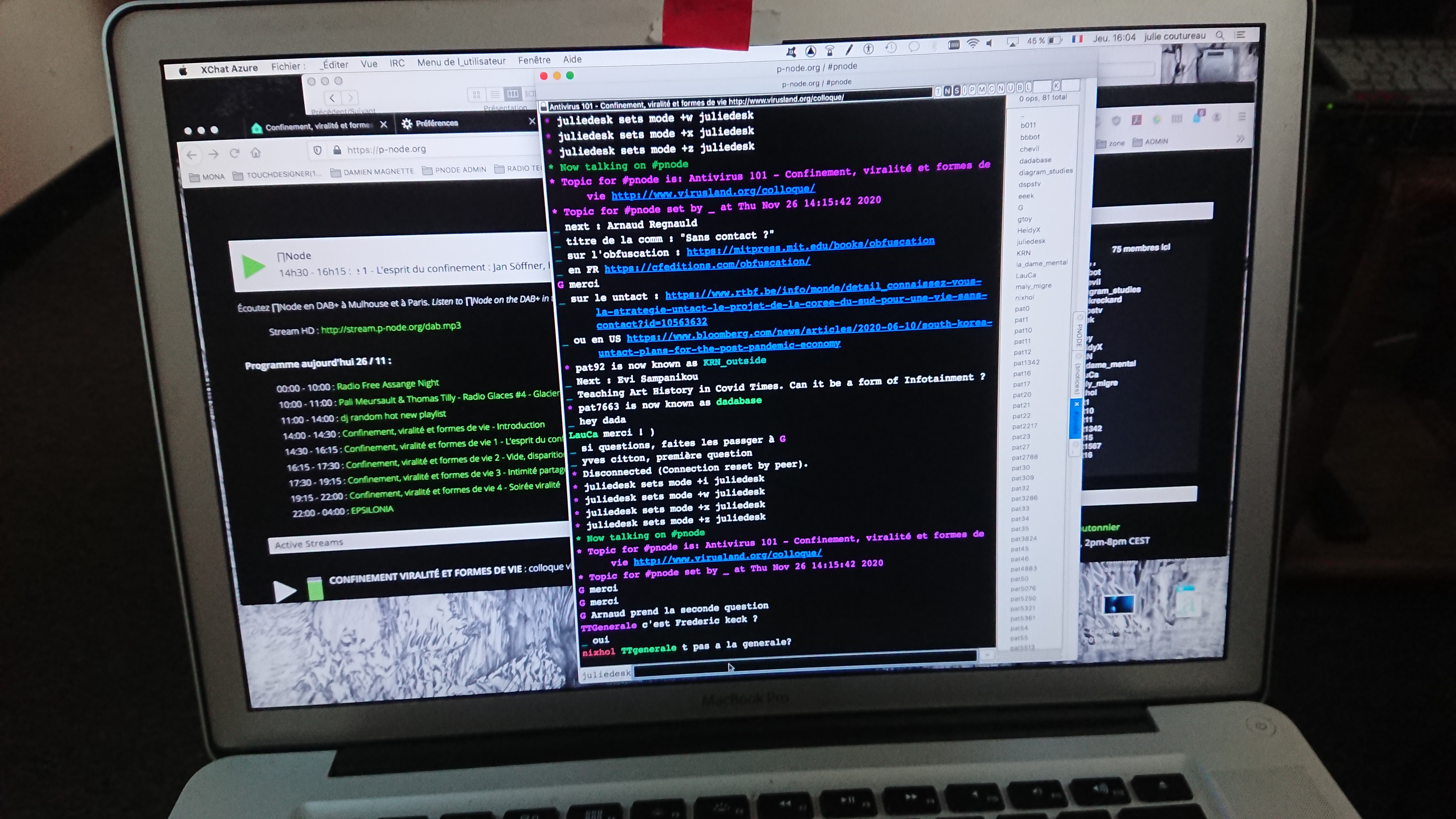 La pandémie engage de nouvelles formes de vie, médiatisées par les technologies et organisées par une viralité qui n'est pas seulement biologique. Comment décrire, analyser, performer et détourner ces formes confinées de la vie ? Ce colloque se focalise sur plusieurs points : l'ambiguïté de la viralité entre biologie et information, l'accentuation de la distance impliquée dans la relation sensible, et le rôle des technologies numériques dans le confinement. Le colloque réunit des interventions théoriques et des performances d'artistiques. Il se déroule entièrement « à distance », en « visio », sur les mêmes plateformes où ont lieu « l'école à la maison » et les apéros en ligne. Il s'agit de détourner la distance pour inventer des modes d'expressions collectifs.